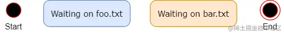 每个状态表示函数中一个不同的暂停点。"Start"和"End"状态表示开始执行的函数和执行结束的函数。"Waiting on foo.txt"状态表示函数当前正在等待第一个async_read_file的结果。类似地,"Waiting on bar.txt"表示函数正在等待第二个async_read_file结果。