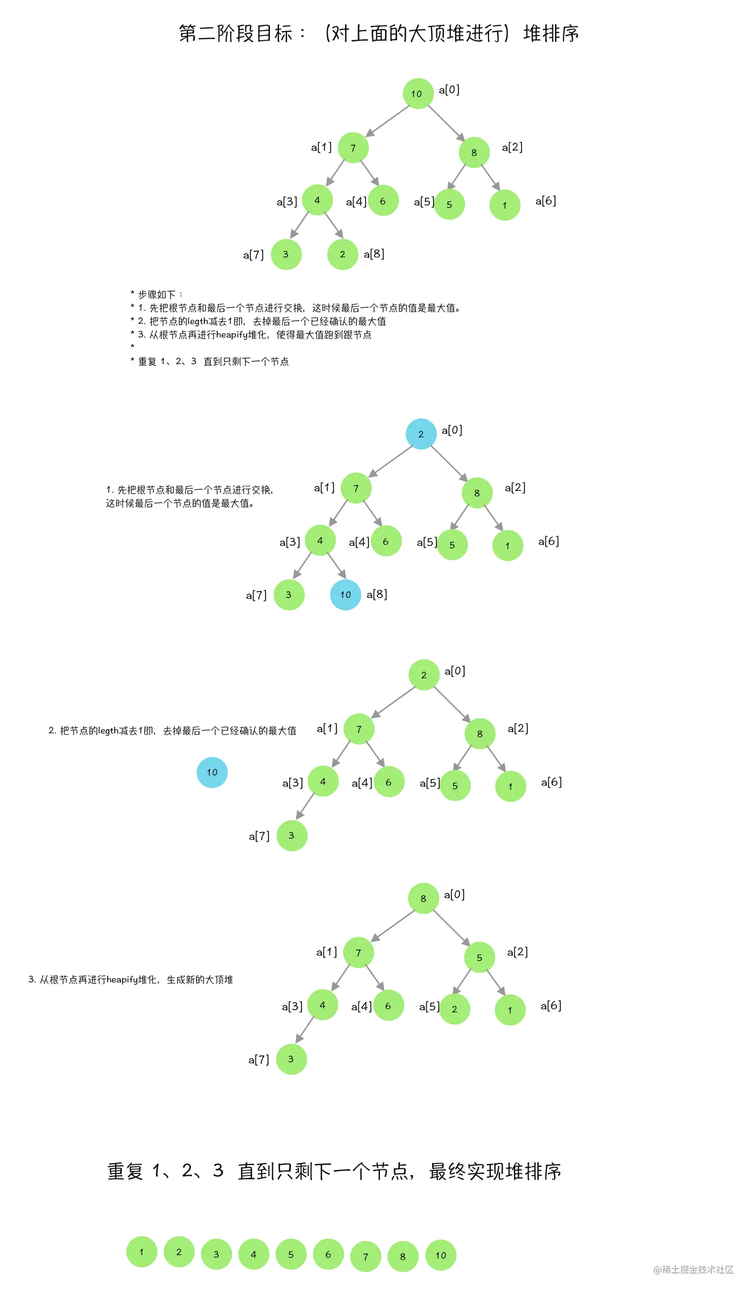 - 循环交换堆顶元素和二叉堆的尾端,砍断最后一个子节点(可理解为堆的个数减少一个),再次调整堆产生新的大顶堆。