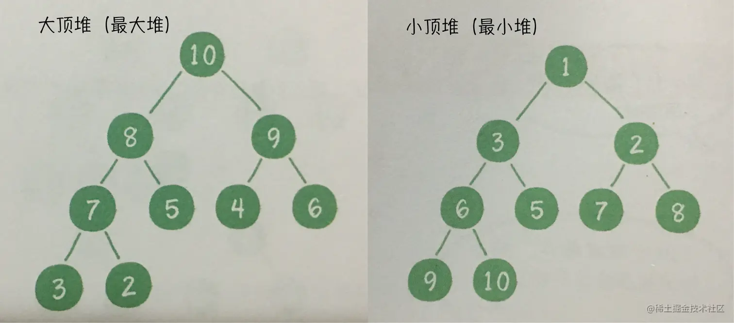 最小堆(小顶堆):任何一个父节点的值,都小于等于它的孩子节点的值,即 堆顶是堆中最小的元素。