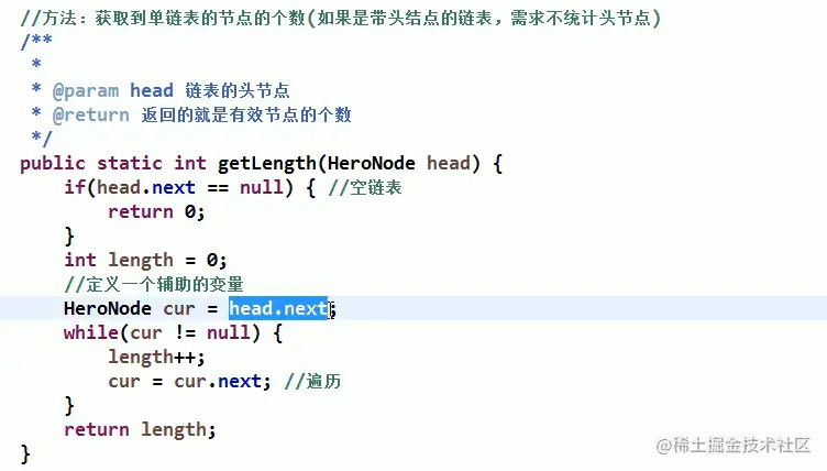 思路: 循环,如果节点的下一个不为空,则节点存在,节点向后移。直至某个节点的下一个为空,返回有效节点个数。
