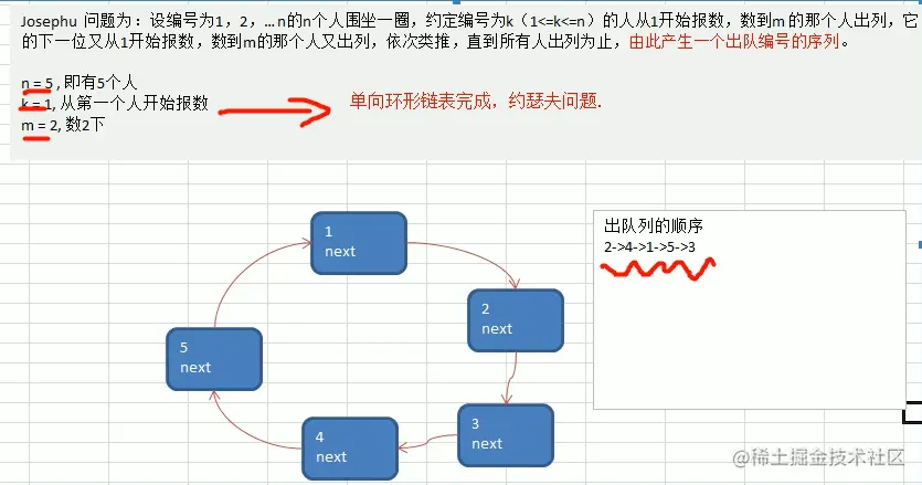 Q: 约瑟夫问题、丢手帕问题(单项环形列表):