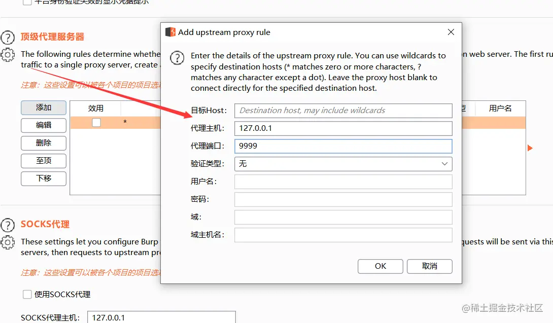 2.在burp中添加顶级服务器 代理主机127.0.0.1,端口9999