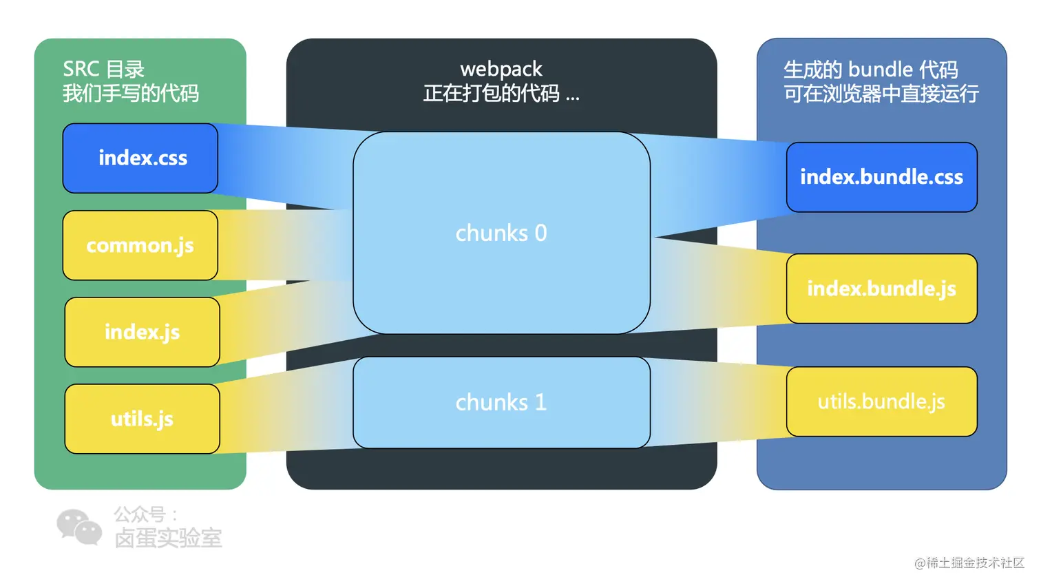 其中utils.js和index.js是两个入口文件,所以是两个chunk。分离css,所以生成了3个bundle: index.bundle.css、index.bundle.js和utils.bundle.js。前两个属于chunk 0 ,最后一个属于chunk 1。
