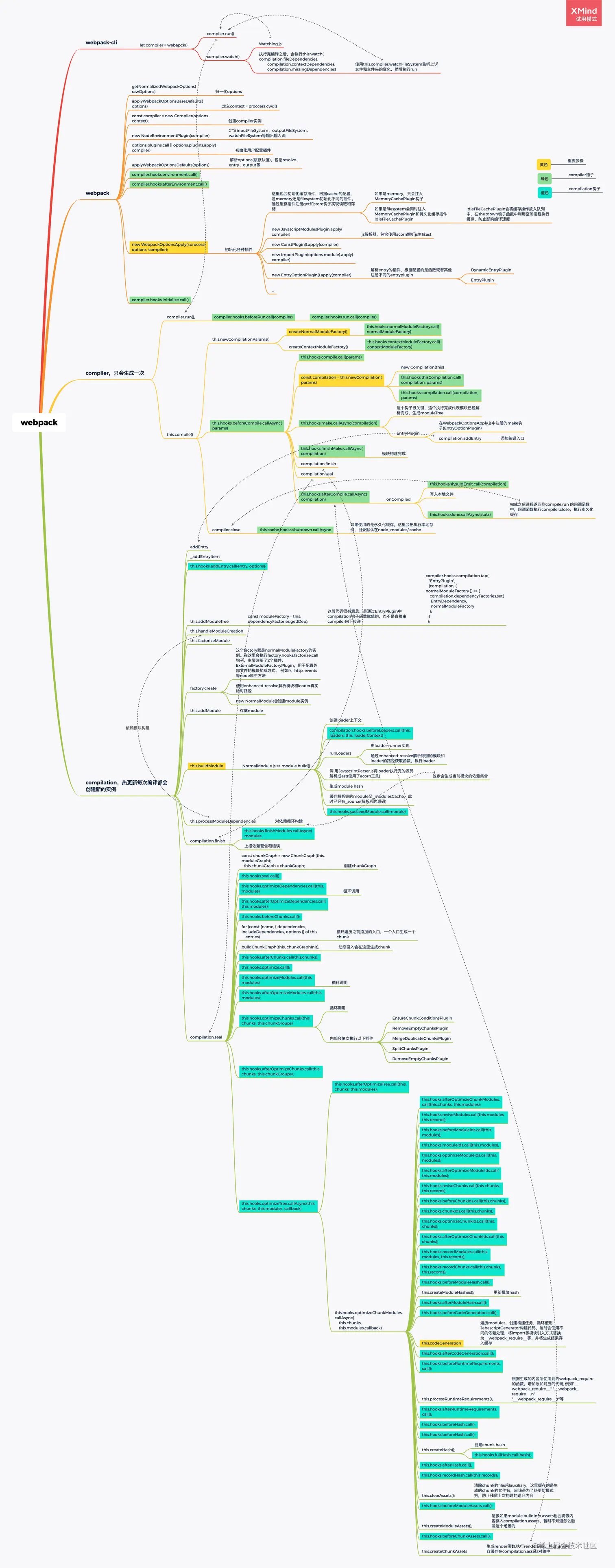 黄色标注代表重要节点绿色标注代表compiler的钩子函数蓝色标注代表compilation的钩子函数,因为太多了,后续一些产物生成的钩子可能不是很全。