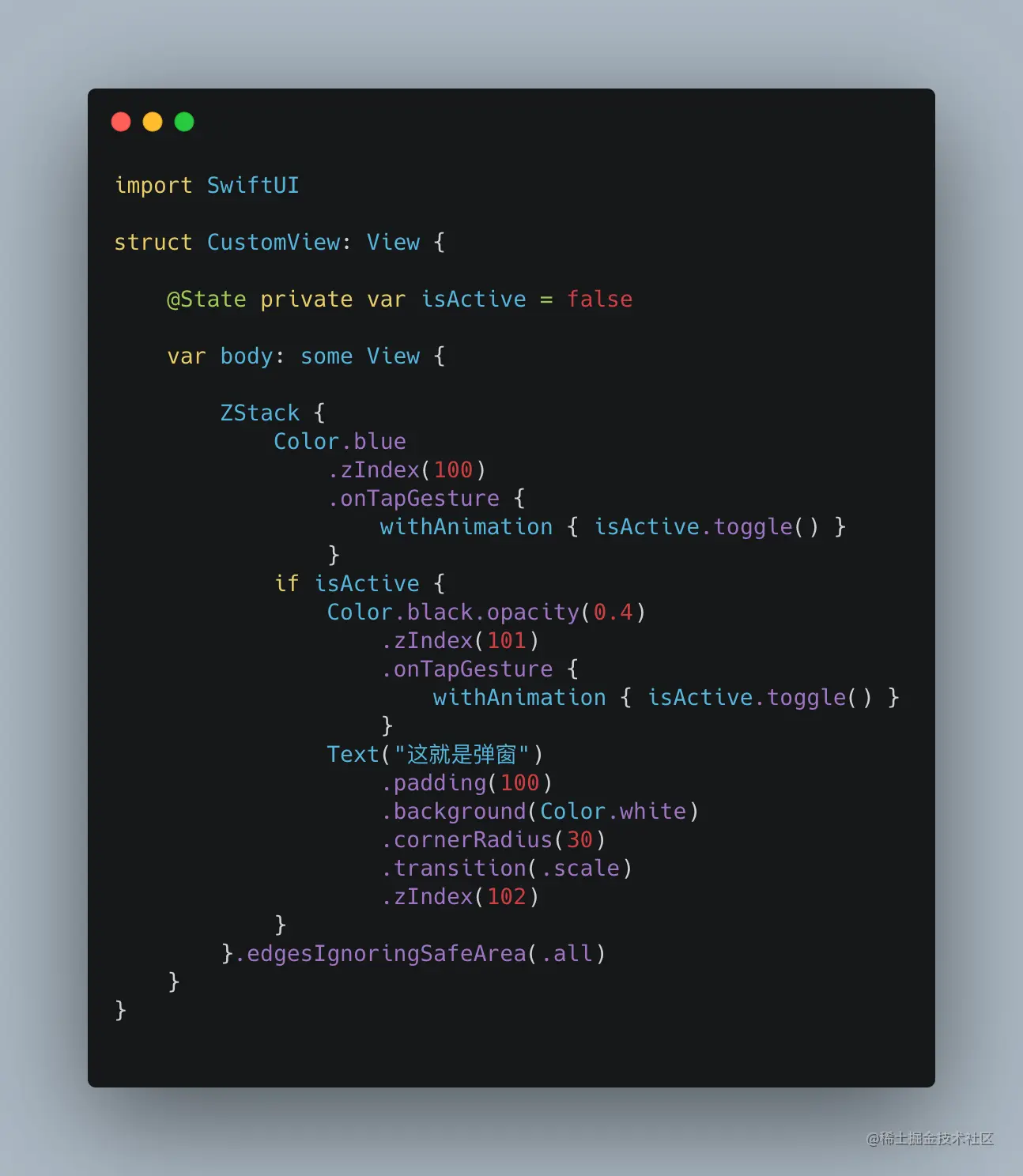 在 SwiftUI 上实现一个弹窗的效果很简单。只需要用 ZStrck 嵌套俩 View 就行了。