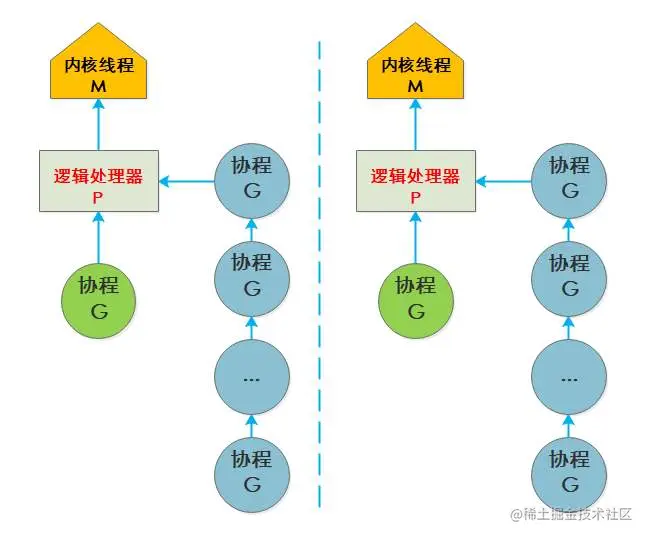 P:表示逻辑 processor,P 的数量决定了系统内最大可并行的 G 的数量(前提:系统的物理 cpu 核数>=P 的数量);P 的最大作用还是其拥有的各种 G 对象队列、链表、一些 cache 和状态。每个 G 要想真正运行起来,首先需要被分配一个 P(进入到 P 的 local runq 中)。对于 G 来说,P 就是运行它的“CPU”,可以说:G 的眼里只有 P。