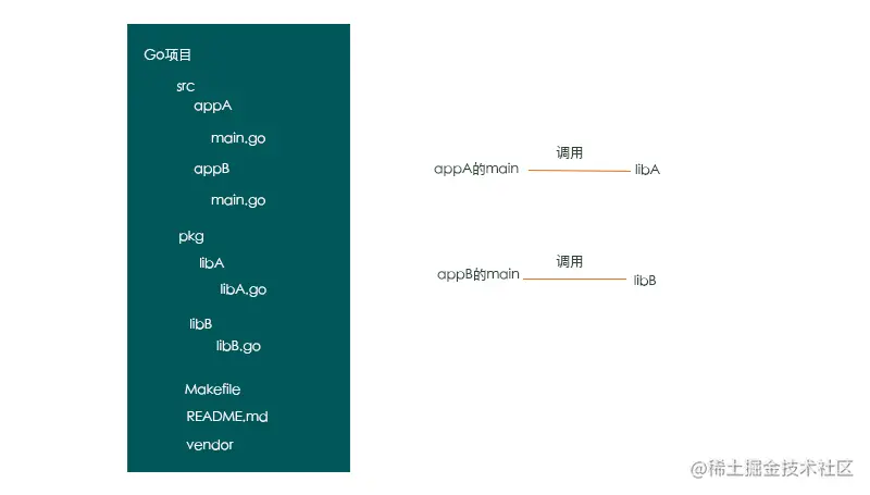 - 1 src 目录:存放项目要编译构建的可执行文件对应的 main 包的源文件。如果有多个可执行文件需要构建,每个可执行文件的 main 包单独放在一个子目录中,比如图中的 appA、appB;src 目录下的各 app 的 main 包将整个项目的依赖连接在一起。我们在 main 包中会做一些命令行参数解析、资源初始化、日志设施初始化、数据库连接初始化等工作,然后会将程序的执行权交给更高级的执行对象。