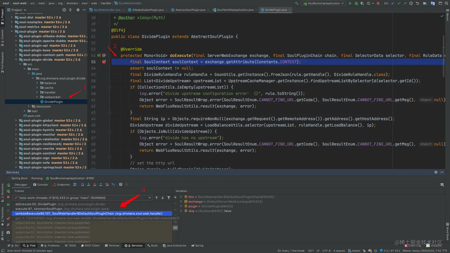Soul的核心功能是通过插件实现的,找到 divide 插件,打断点,debug