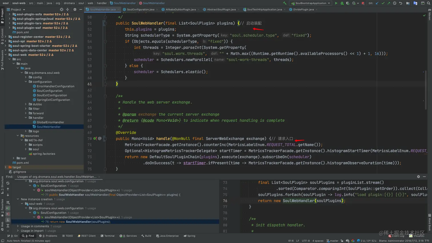 执行插件,因为Soul的核心功能跟插件直接相关,所以重点关注插件的来源,可以看到excute方法中plugins的来源只有DefaultSoulPluginChain的构造函数,而DefaultSoulPluginChain构造函数中plugins的来源只有SoulWebHandler的成员变量