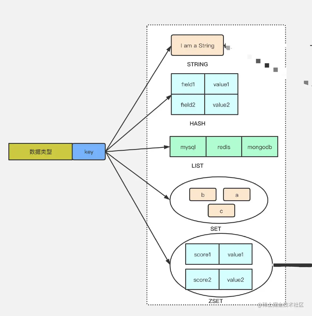 首先我们要对Redis 支持的数据类型要有一个直观的感受,这时候可以通过图片来帮助我们理解。