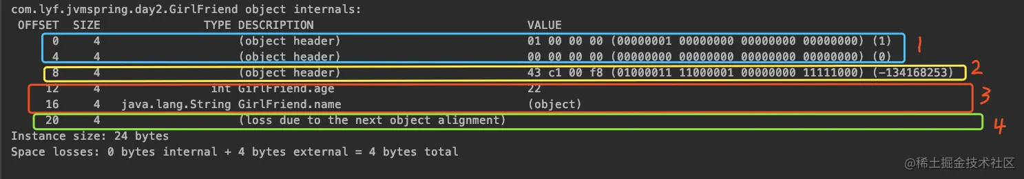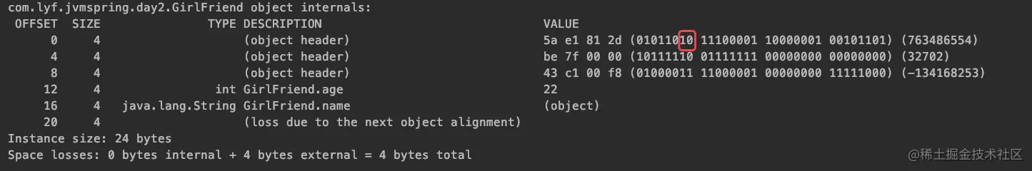 System.out.println(ClassLayout.parseInstance(girlFriend).toPrintable());