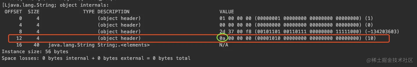 显而易见,这边我们初始化一个大小为10的String数组,这里对象头的位置就多了一块用于记录数组长度的数据。