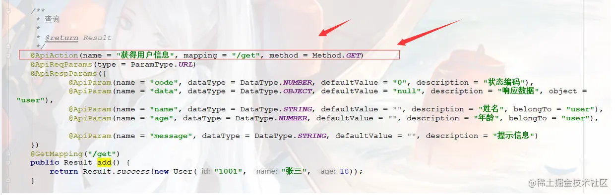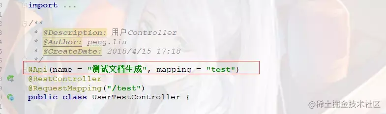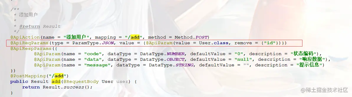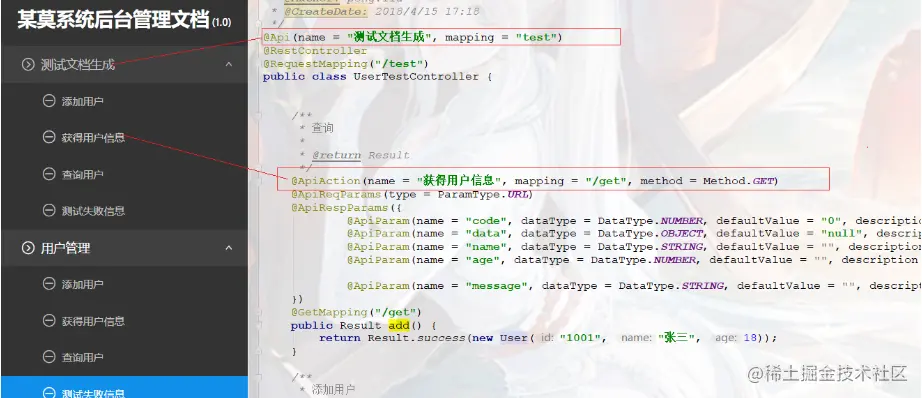 一个详细例子如下代码,这里是springboot/springmvc的controller示例(展示两个文档,前端接口和后台接口)参考代码这个类 UserController.java