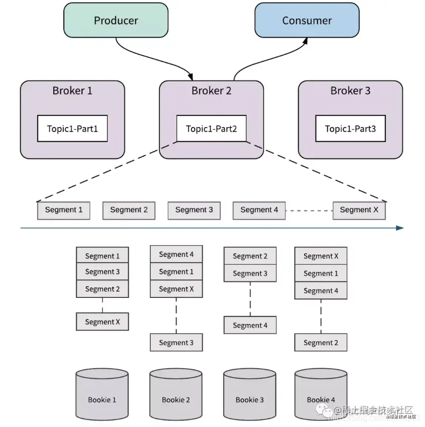 不论是 Kafka,RocketMQ,还是 Pulsar 作为消息队列中间件最为重要的组成为以下三个部分: