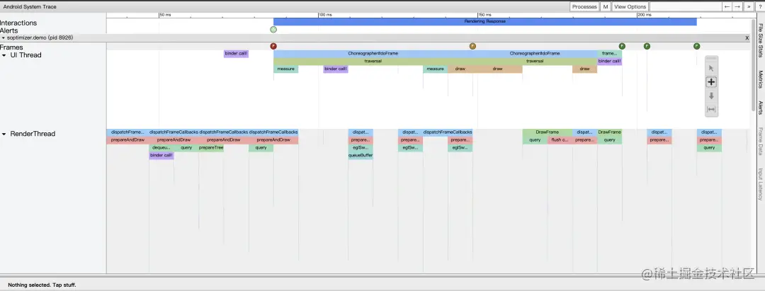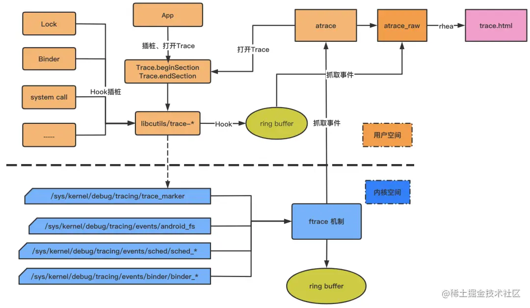 其中,用户空间的数据包括了应用层的自定义 Trace、系统层的 gfx 渲染相关 Trace、系统层打的锁相关的 Trace 信息等,其最终都是通过调用 Android SDK 提供的 Trace.beginSection 或者 ATRACE_BEGIN 记录到同一个文件点/sys/kernel/debug/tracing/trace_marker 中的。此节点允许用户层写入字符串,ftrace 会记录该写入操作时的时间戳,当用户在上层调用不同函数时,写入不同的调用信息,比如函数进入和退出分别写入,那么 ftrace 就可以记录跟踪函数的运行时间。atrace 在处理用户层的多种 trace 类别时,只是激活不同的 TAG,如选择了 Graphics,则激活 ATRACE_TAG_GRAPHICS,将渲染事件记录到 trace_marker。