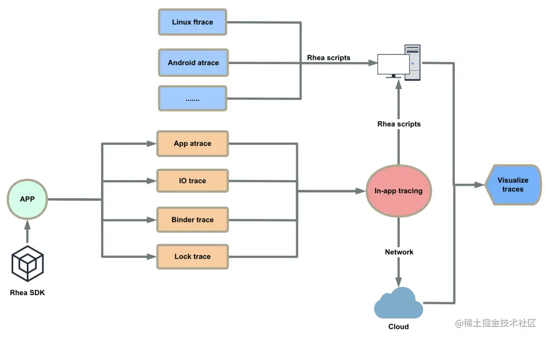 整体上,App 通过集成 Rhea SDK 在打包时不限层级插入函数耗时桩方法,在运行时插入 IO、Binder、Lock 等相关 Trace 信息,支持动态配置,统一 Trace 格式为 atrace,同时支持获取系统级别的 Linux ftrace、Android Framework atrace 和 App 插入的 atrace 信息,能够不依赖 PC 抓取,最终提供可视化显示。具体实现如下: