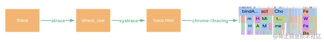 Systrace 是 Android 性能调试优化的常用工具,它可以收集进程的活动信息,如函数调用耗时、锁等;也可以收集内核信息,如 CPU 调度、IO 活动、Binder 调用信息等;这些信息会统一时间轴,在 Chrome 浏览器中显示出来,方便工程师性能调试、优化卡顿等工作。因此,抖音早期性能优化首选 Systrace 作为主要工具,其大致流程如下: