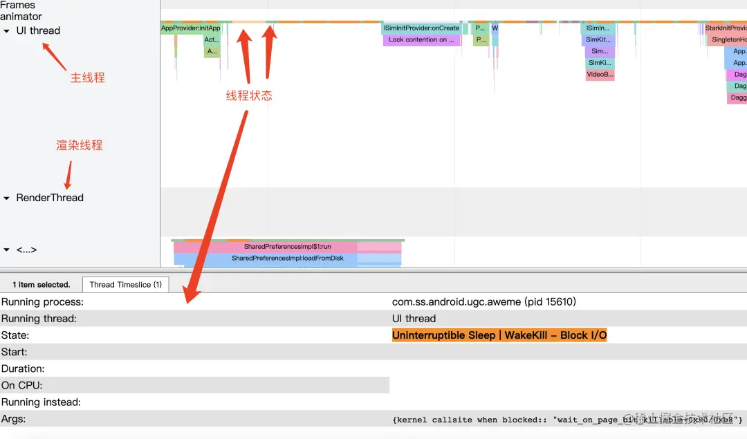 在做抖音在启动路径上性能优化时,我们统计了冷启动的耗时,其中占比最长的是进程处于 D 状态(不可中断睡眠态,Uninterruptible Sleep ,通常我们用 PS 查看进程状态显示 D,因此俗称 D 状态)的时间,这部分耗时占比占总启动耗时的 40%左右,进程为什么会被置于 D 状态呢?处于 uninterruptible sleep 状态的进程通常是在等待 IO,比如磁盘 IO,其他外设 IO,正是因为得不到 IO 的响应,进程才进入了 uninterruptible sleep 状态,所以要想使进程从 uninterruptible sleep 状态恢复,就得使进程等待的 IO 恢复。类似如下: