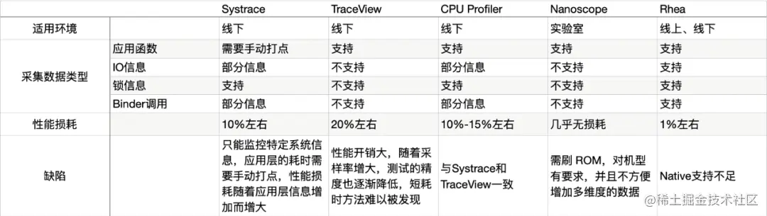 当前,Systrace 只能监控特定系统信息,监控应用层的耗时则需要手动打点;TraceView 性能跟采样率关系密切,采样过于频繁性能开销巨大,采样过低又难以精准发现问题函数;Nanoscope 虽然几乎没有性能损耗,但每次都需定制 ROM 刷机,使用成本非常高,并且这些工具都只支持 debugable 的应用程序线下分析,这些工具在针对 APP 性能优化都有不甚完美之处,而 Rhea 是一个集大成者,融合了各工具优势并弥补了相关缺陷。