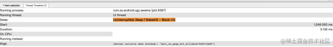 Running: 线程在正常执行代码逻辑Runnable: 可执行状态,等待调度,如果长时间调度不到,说明 CPU 繁忙Sleeping: 休眠,一般是在等待事件驱动Uninterruptible Sleep: 不可中断的休眠,需要看 Args 的描述来确定当时的状态Uninterruptible Sleep- Block I/O: IO 阻塞