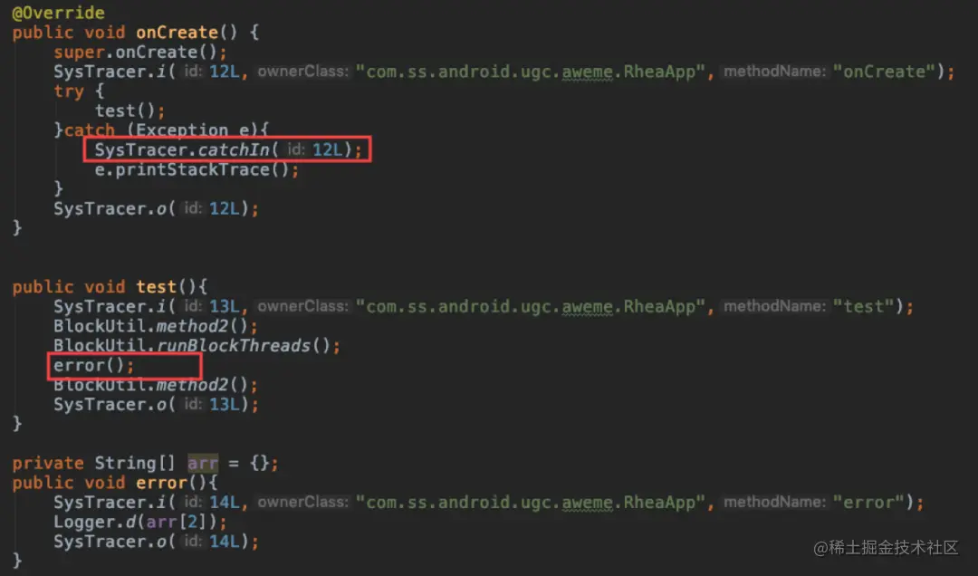 分析发现,主要原因在于方法在运行期执行中被中断,例如:方法执行过程中发生异常后,被其调用者方法捕获,发生异常方法的 Systracer.o 方法未被调用。如图:test 方法中的 error 方法执行时出现 arr[2]的数组越界,导致 test 方法中的插桩方法 SysTracer.o(13L)未调用,异常被 onCreate 中的 catch 块捕获,从而导致 test 的插桩方法没有被成对调用,最终导致了 test 外层所有的方法调用都无法正确闭合。(注意:本小结提到的桩方法,即 SysTracer 相关方法,均是通过字节码插桩自动插入)