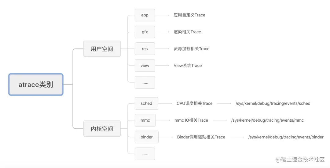 为了实现不依赖 PC 抓取 Trace,我们有必要先了解下 Android atrace 的实现机制。首先,是 atrace 包括的数据源包括: