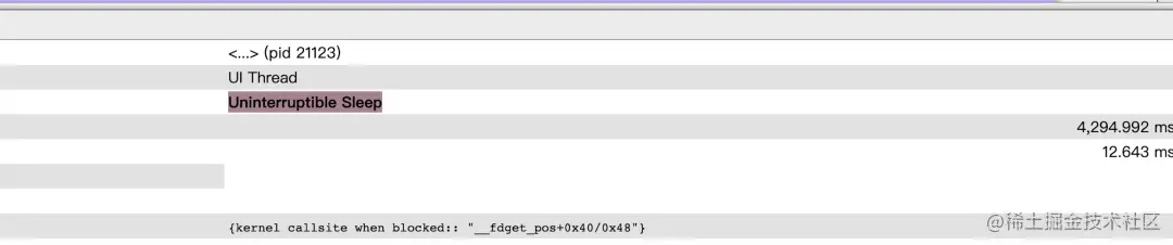 在实际使用过程中发现,在开启 Systrace 之后,对应 Sleep 耗时占比在极端情况下会超过 40%以上。一方面是 APP 锁带来的 Sleep 耗时。例如,在抖音启动路径上 SharedPreference 优化过程中,在开启 Rhea 1.0 的 Systrace 功能后,发现 SP 调用存在明显的锁耗时,当时针对 SP 进行了一番锁的优化后,上线发现效果并不明显,后续经过一系列排查,发现锁的耗时是由于开启 Systrace 功能后导致。另一方面是 IO 带来的 Uninterrupt Sleep 耗时。例如,我们在一次性能优化过程中看到了很多__fdget_pos 操作,对_fdget_pos 操作相对 Uninterruptible Sleep 的占比统计了下,至少占了 Uninterruptible Sleep 总耗时的 60%左右。我们花了比较长时间,额外加了很多 IO 的信息,最终定位原因是在开启 Systrace 后,由于所有线程的 trace 都会写入同一个文件,所有线程会同步竞争内核态的文件 pos 锁导致。工具本身的性能问题误导了我们的排查方向,同时也暴露了在排查这种 IO Wait 问题的时候由于 IO 信息不全导致排查效率不高的问题。