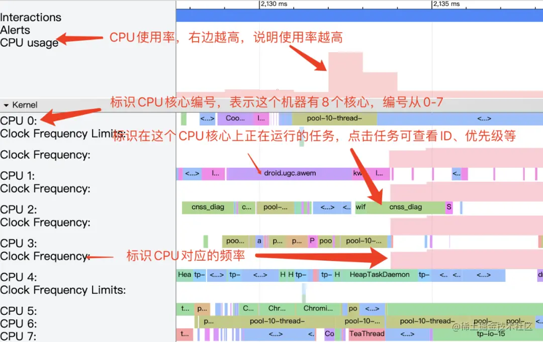 而内核空间的数据主要是一些补充的分析数据 freq、sched、binder 等,常用的比如 CPU 调度的相关信息包括: