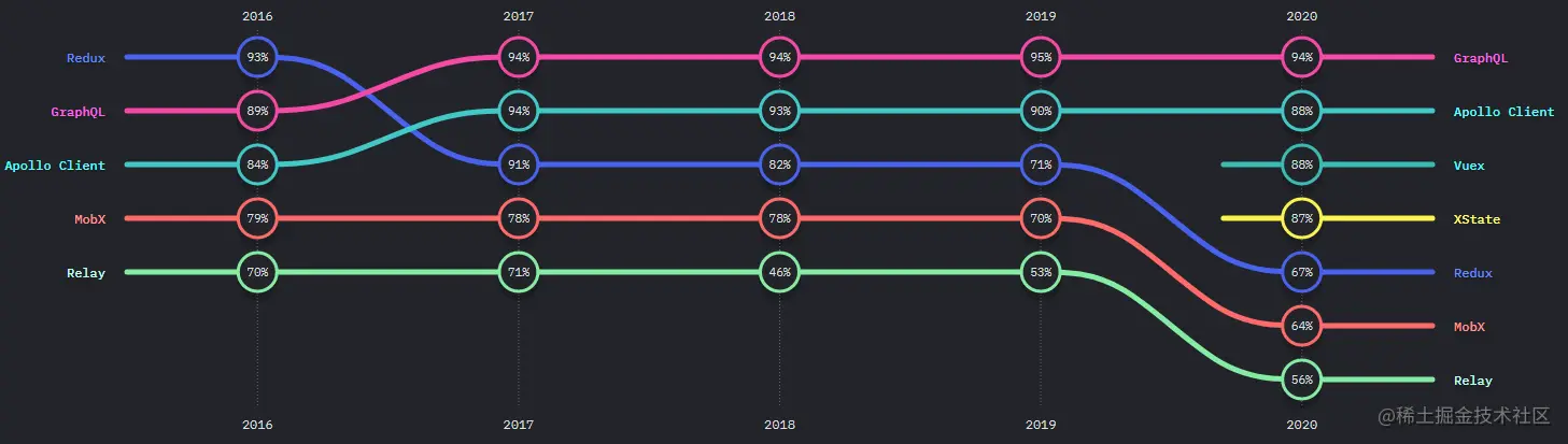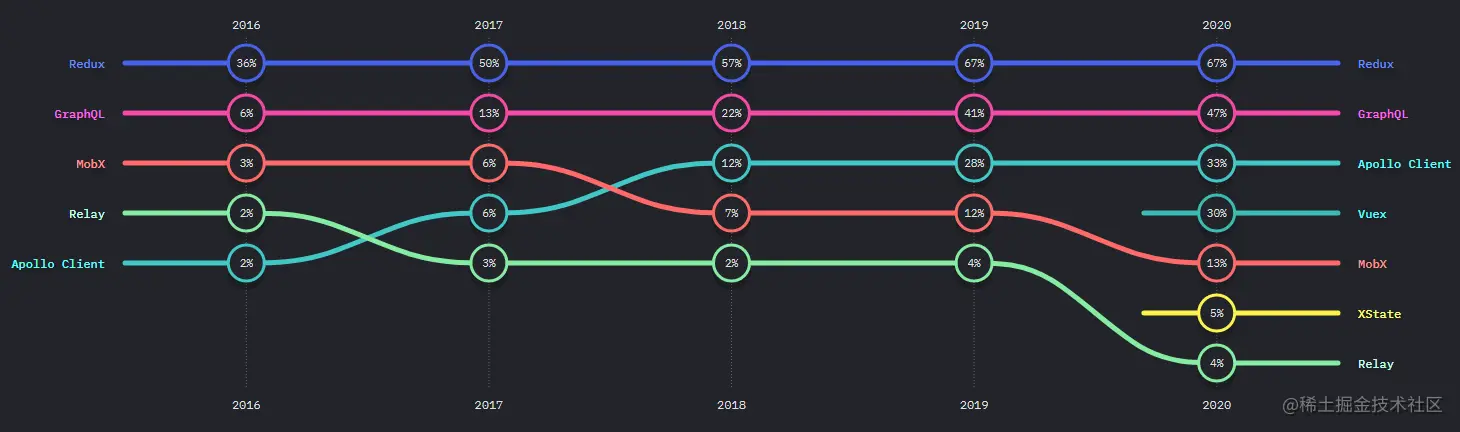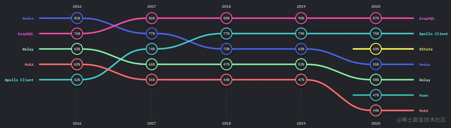 使用排名比较高的状态管理依旧是Redux、Vuex、Mobx。数据管理为GraphQL和Apollo,并且XState横空出世。