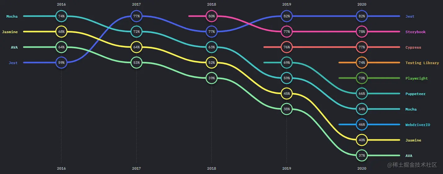 根据上图可知,第一名:Jest、第二名:Mocha、第三名:Storybook。