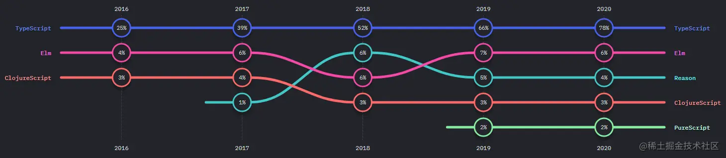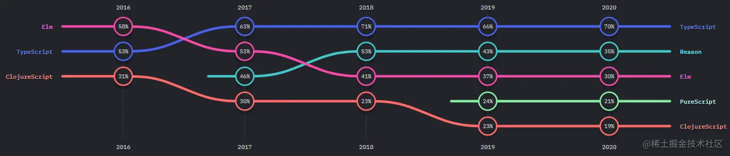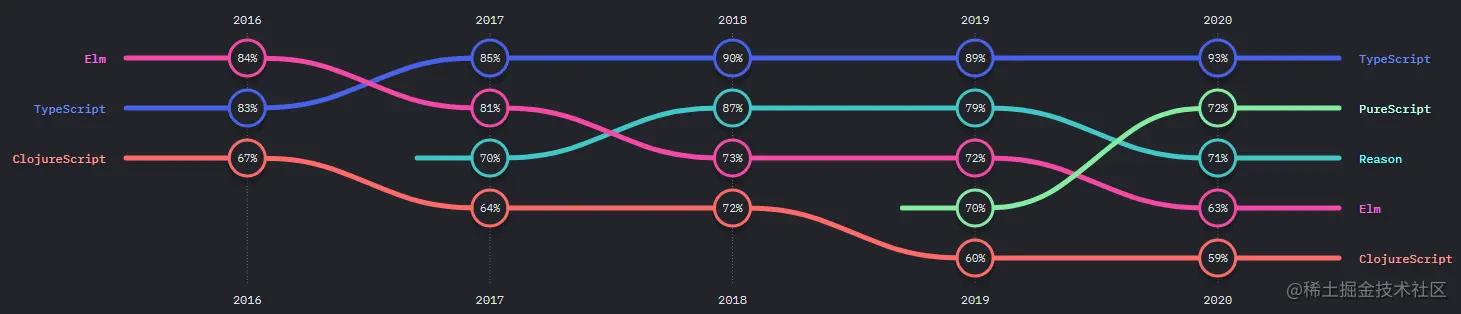 根据上图可知,第一名:TypeScript、第二名:Elm、第三名:Reason。