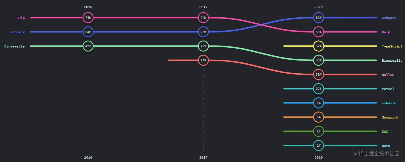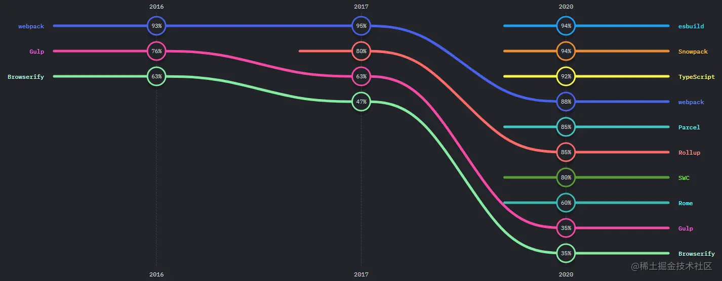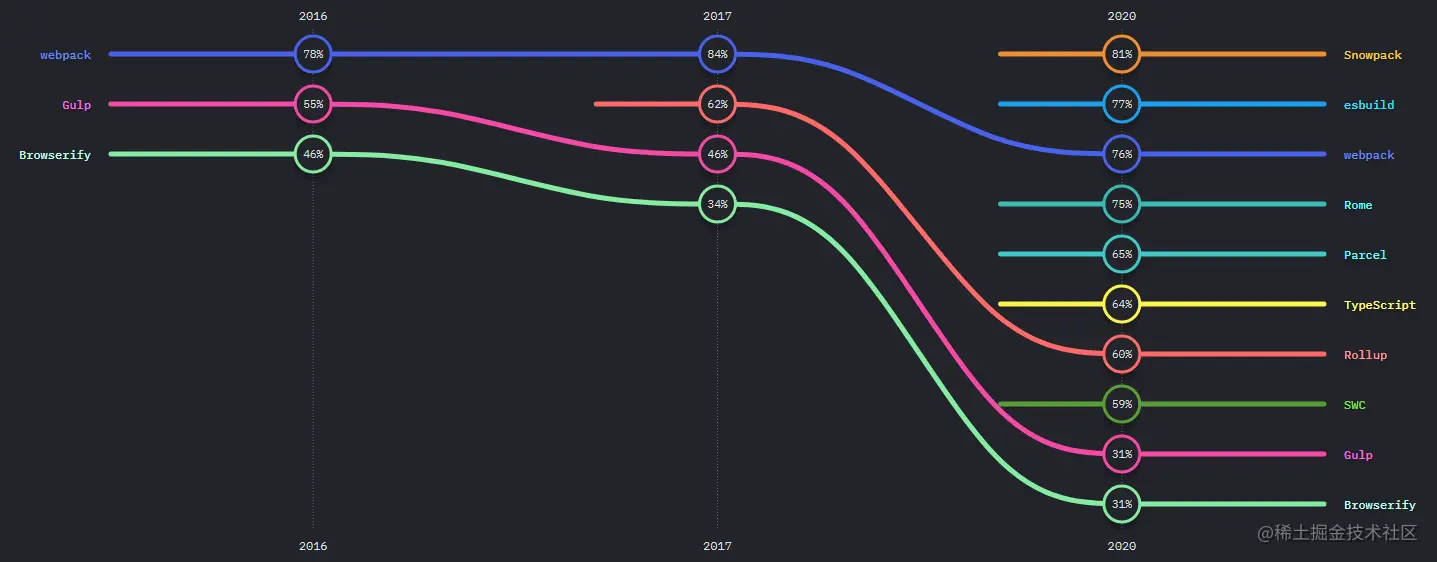 虽然短时间内webpack使用量还处于霸主地位,这一年打包工具的发生了巨大的变化。可以说这里发生了天翻地覆的变化。从Parcel到Snowpack,再到后来的esbuild,每一个都是打包的好手,至于Vite为什么没有在其中,我猜想,Vite最开始只是为了解决Vue单个框架的方向,受众面不够广泛(现在它已经支持了多种框架的打包了)。