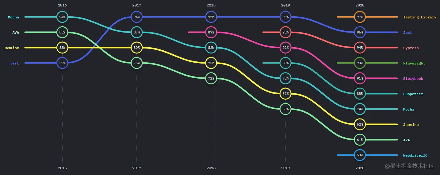 根据上图可知,第一名:Testing Library、第二名:Jest、第三名:Cypress。