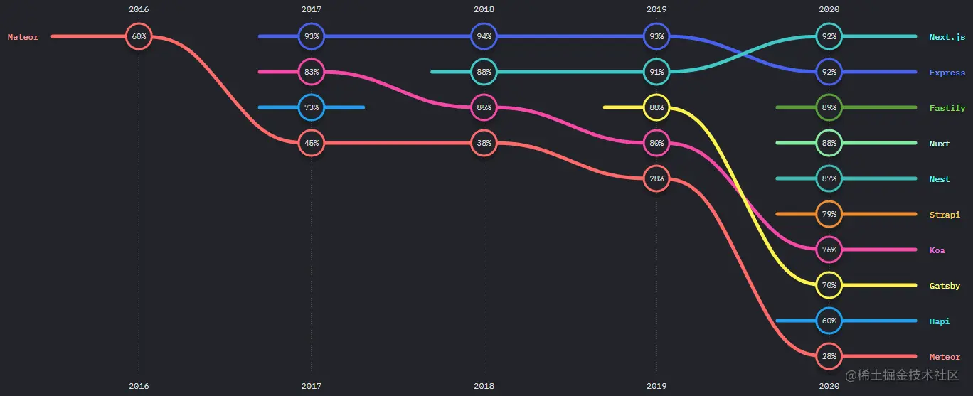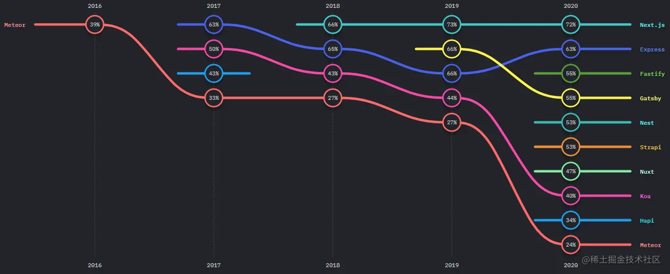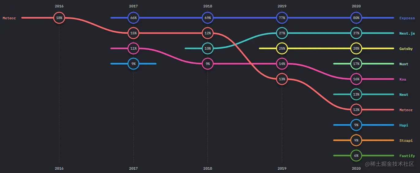 Express依旧是统治地位,而Next和Nuxt这些服务端渲染的框架也逐渐成为大家的所选的框架。