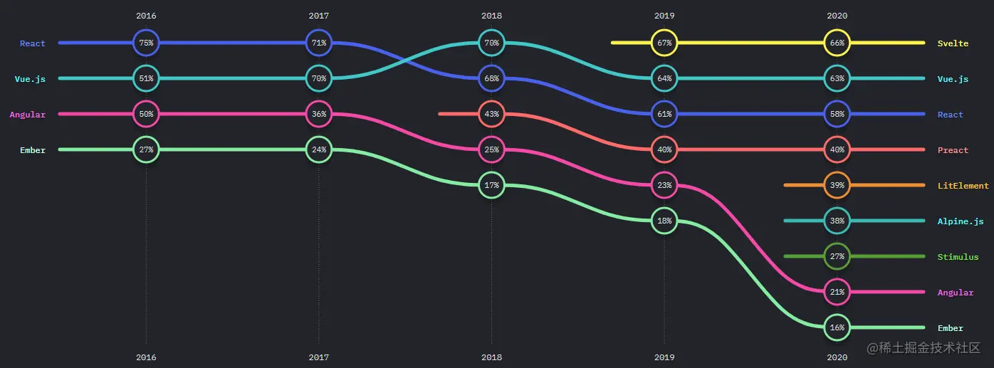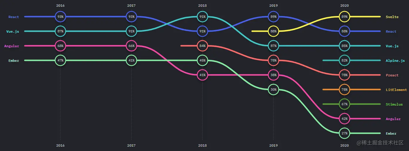 根据上图可知,第一名:Svelte、第二名:React、第三名:Vue.js。