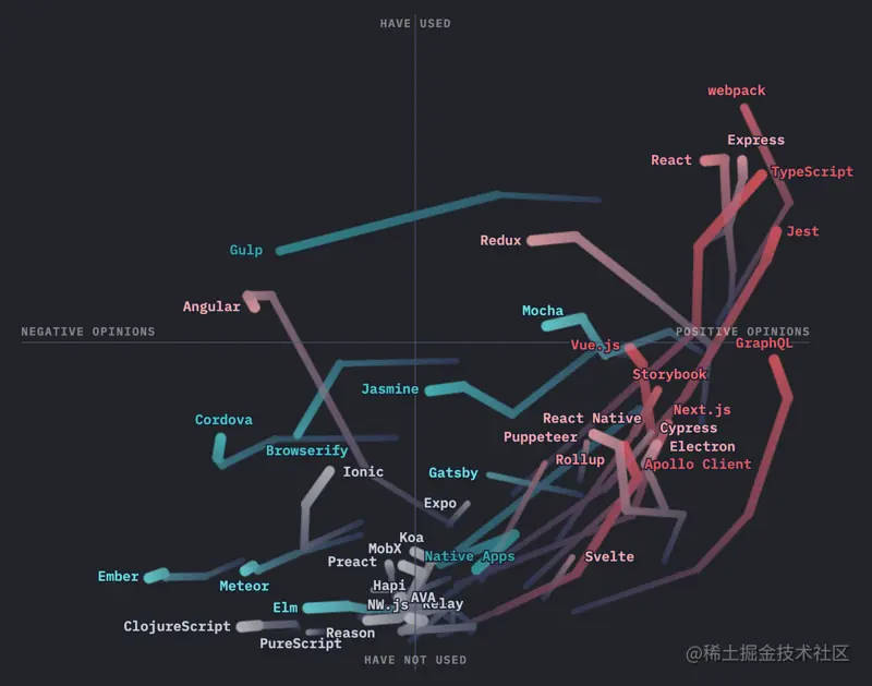 从上图中可以看出随着年限的的增长,webpack、Express、React、TypeScript、Jest位于榜单前列。