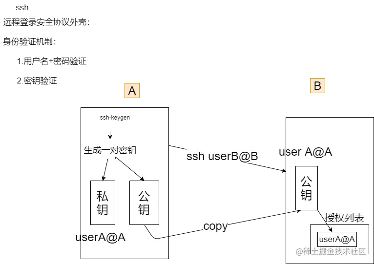 回到话题,A生成一队密钥,然后讲公钥复制到B的授权列表,当A再次登录B时,会将私钥带过去和公钥验证。当B的授权队列中存在A时,就通过验证。