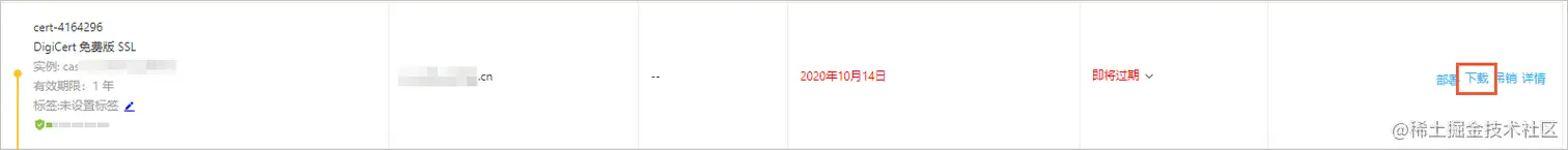 在SSL证书页面,定位到需要下载的证书实例并单击证书卡片右下角的下载。