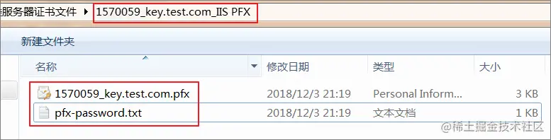 解压已下载保存到本地的IIS证书文件。您将看到文件中有一个证书文件(以.pfx为后缀或文件类型)和一个密钥文件(以.txt为后缀或文件类型)。