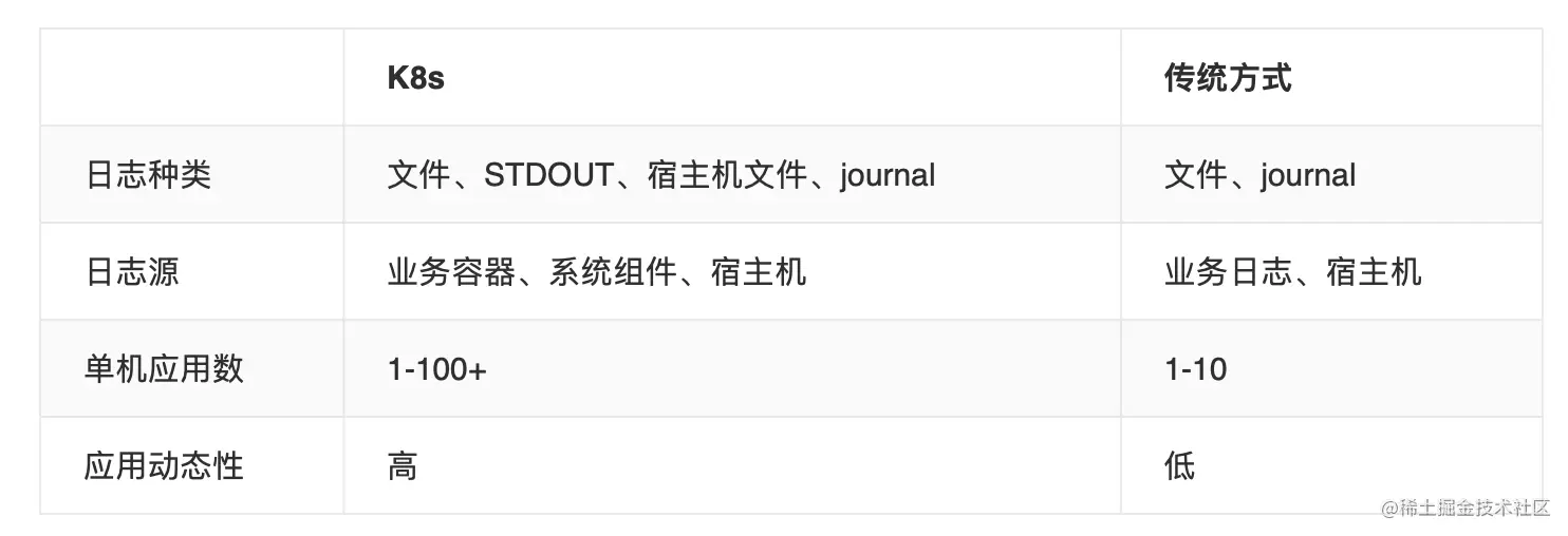 在 K8s 里,日志的收集相比传统的物理机、虚机等方式要复杂一些,因为 K8s 所提供的是动态的环境,像绑定 hostpath 这种方式是不适用的,我们可以通过以下这个表格直观的对比一下: