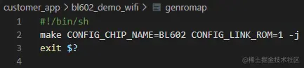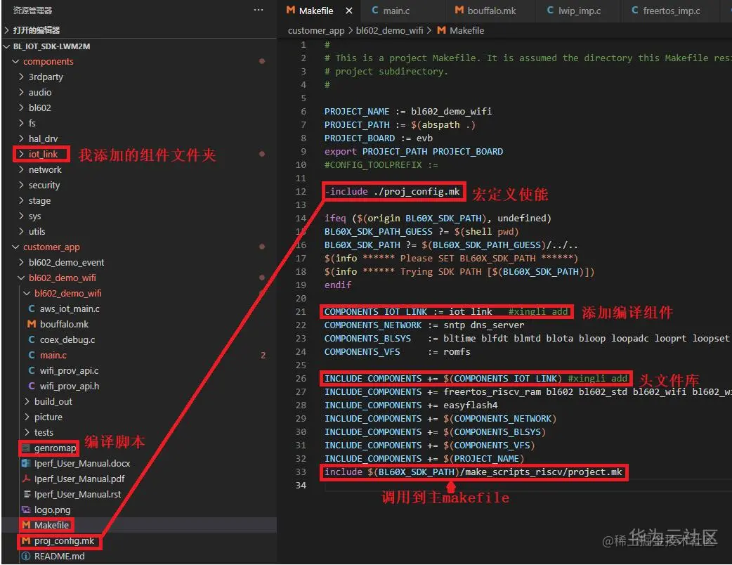 我们知道在运行代码时只需要在控制台输入命令./genromap即可,分析其内部细节,依旧是采用make+参数的形式,则会根据其参数调用同文件夹下的Makefile文件,在该makeifle文件中包含了使用的组件以及对应的头文件名称如我们在components中添加的iot_link组件文件夹以及相应的头文件。在该Makefile中最后一行调用到了主Makefile即$(BL60X_SDK_PATH)/make_scripts_riscv/project.mk文件,该文件会编译调用使能的组件中的buffalo.mk文件,将所有的目标文件链接到一起,生成.bin文件。