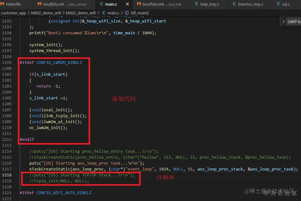 由于了lwm2m内部使用tcpip因此如果使用awkka-lwm2m适配需要适配tcpip层,即sal层的适配,在我们sdk的network/tcpip/sal,注意其中的源文件要添加到上述iot_link的src中,之后适配sal层,由于博流sdk中使用的标准的lwip,这里我们导入lwip_imp.c即可。同时需要在主文件中添加如下代码。同时原来demo的main函数中的ticip_init()函数,因为该函数已在link_tcpip_init()中执行。