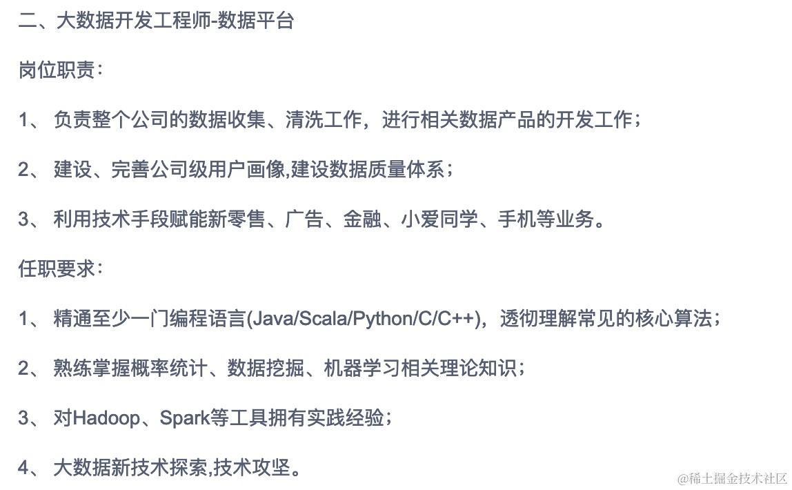 从上面的岗位描述中我们可以发现大数据开发工程师一般会与业务进行对接,要么是基于某一个场景进行有针对性的数据处理,要么是打造一个大数据产品。在这里我们也需要纠正一个小小的概念,可能有些小伙伴认为有大数据岗位需求的公司一定是一个自身具备大量数据、有着大量用户积淀的公司,其实不然。除了分析公司自身业务数据以外,同样可以打造一款通用的大数据产品,大家可以参考我的另一篇文章:如何用开源组件“攒”出一个大数据建模平台。所以大数据的岗位虽然不像普通的开发工程师那么多,但是需求依然存在。
