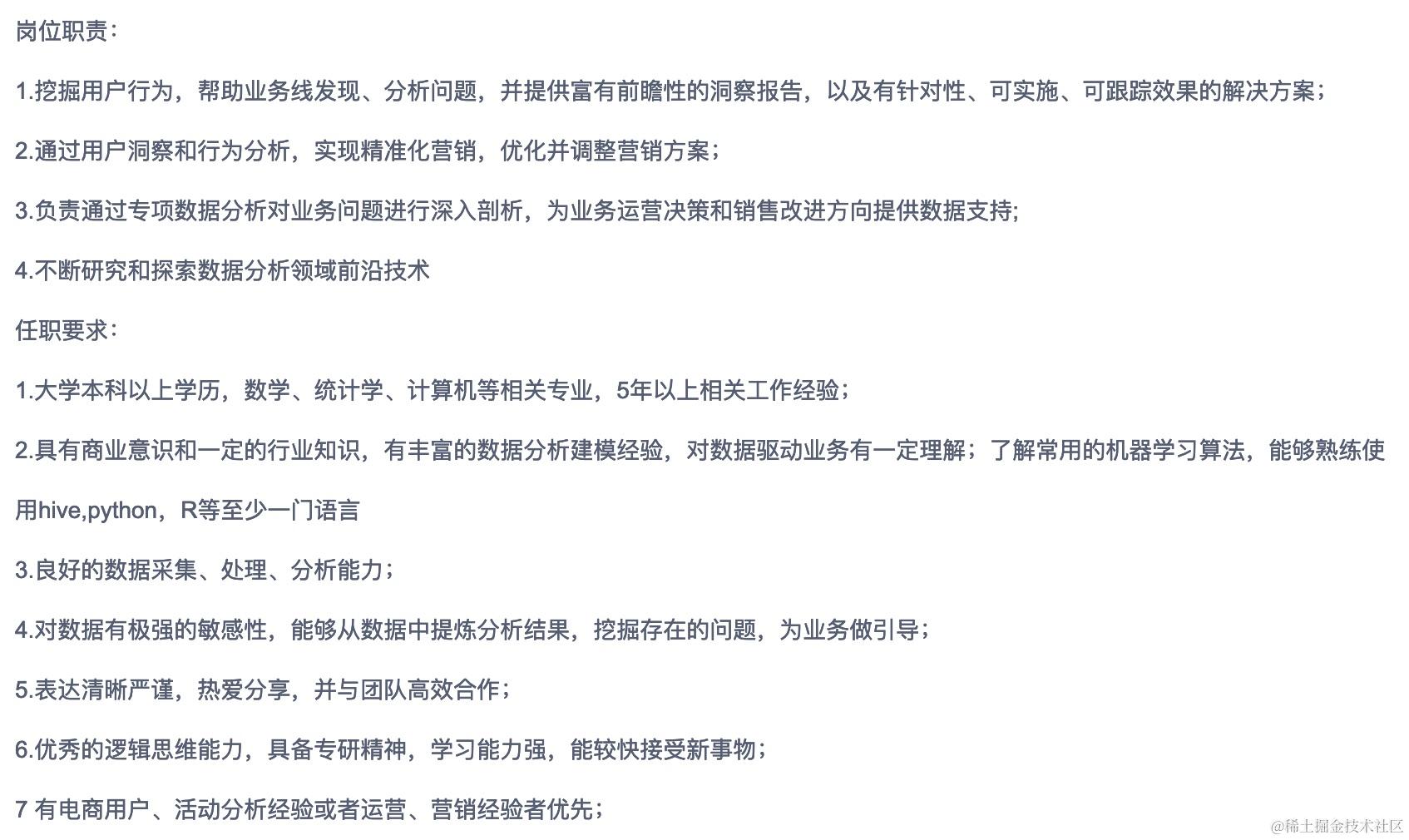 说到数据分析师,这不是本文的重点,因为门槛相对较高,另一方面更偏数学、统计学方向,更多的是与数据、算法打交道,编程的产物通常不是应用,而是一个算法模型。我们还是先来看一看相关的JD: