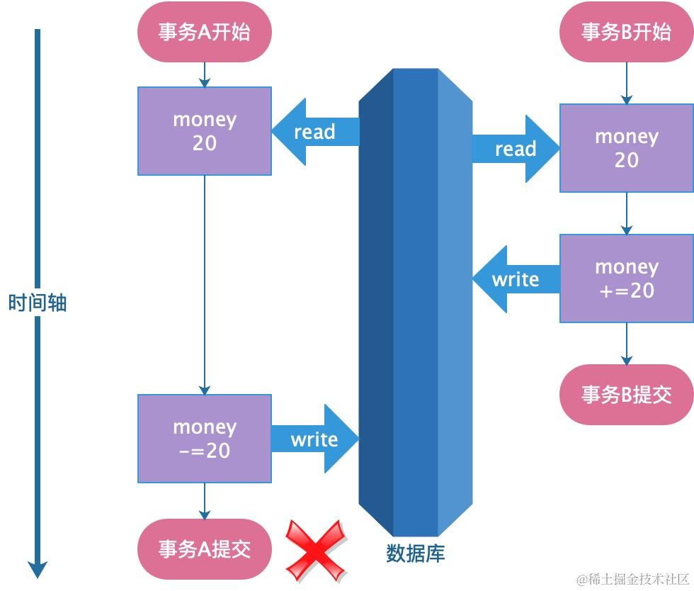 最初数据库中money的值为20,在事务B提交成功后money的值为40,按正常逻辑事务A将money的值减去20,结果应为20,但对事务A来说读取到的值为20,导致最后结果为0。