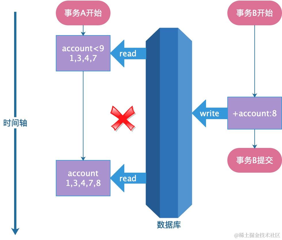 在事务B执行前,事务A得到的结果集为:1,3,4,7,在事务B插入一个新的账户:8后,事务A得到的结果集为:1,3,4,7,8。