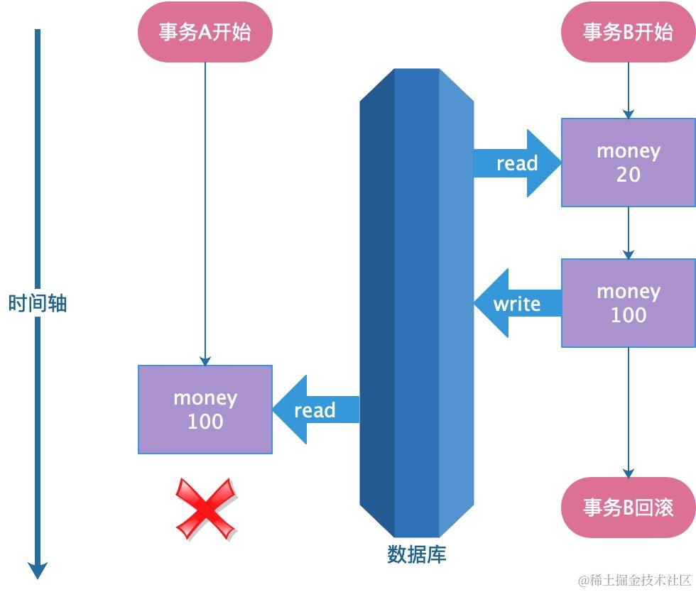 数据库中某条数据的money值为20,在处理过程中,事务B修改值为100,随后被事务A读取,接下来事务B因为其他环节的错误导致回滚,money的值被还原为20,这时事务A所读取的数据即为脏数据(错误数据)。