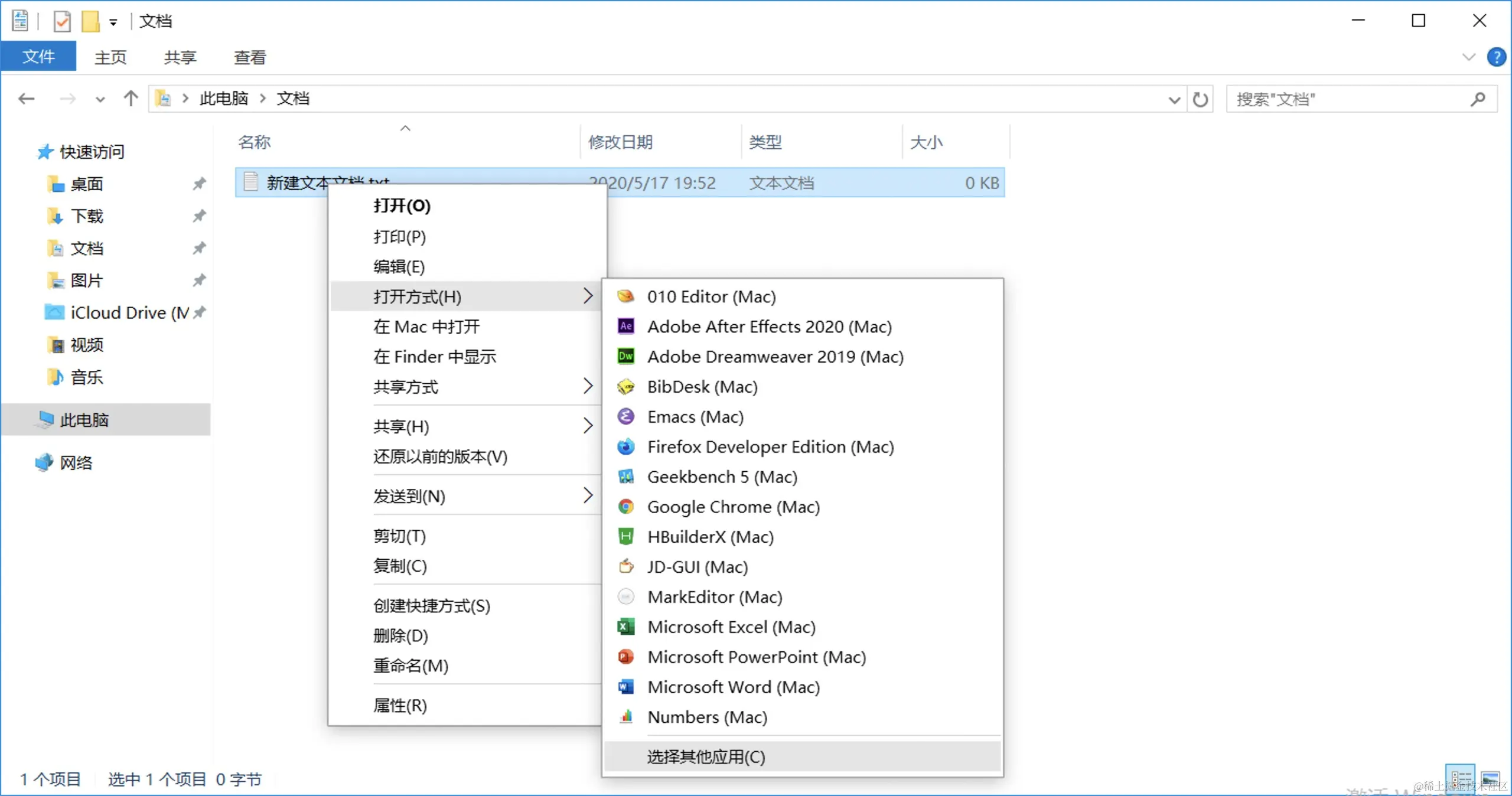 在Windows系统中新建一个文本文件,选择在Mac中打开: