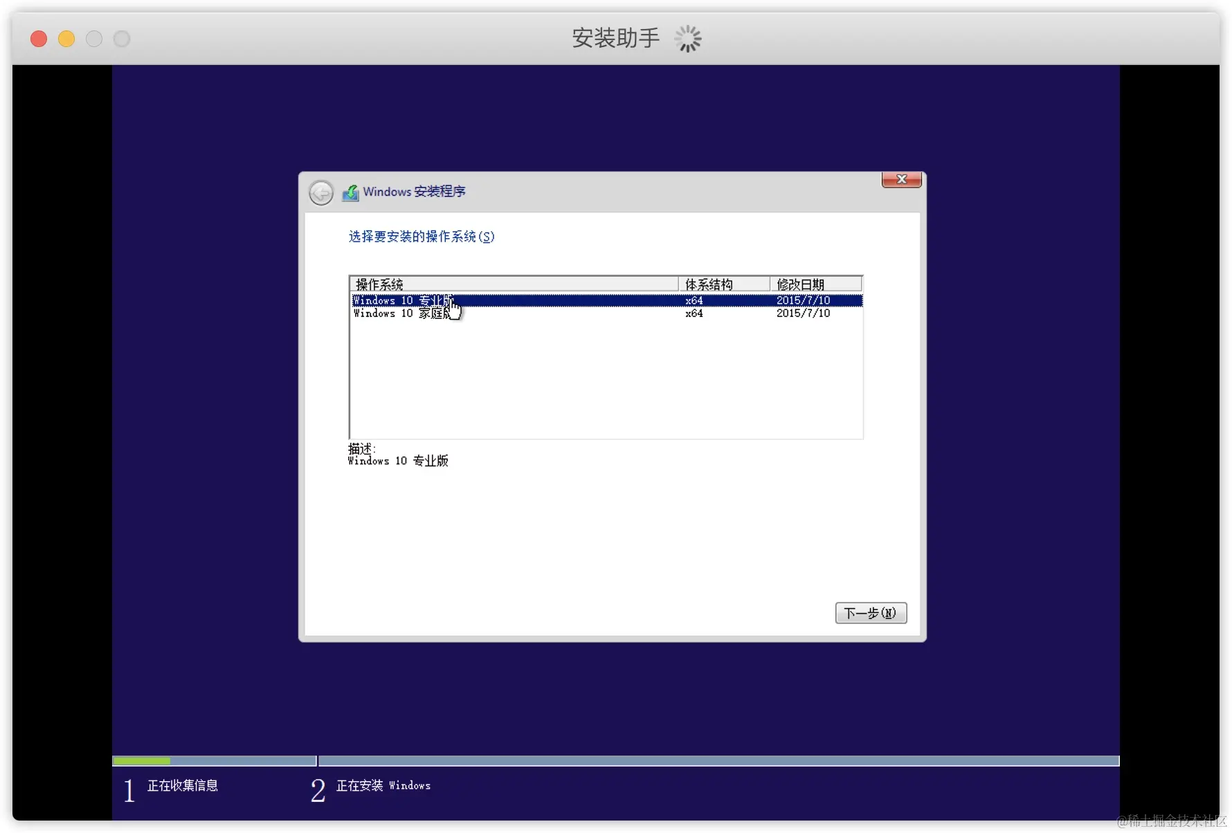 接下来就是常规的Win10系统安装步骤了,基本一直下一步就可以了,和在真实物理机安装系统时一样。在系统安装完成之前,界面会比较小,安装完成之后就会恢复正常。