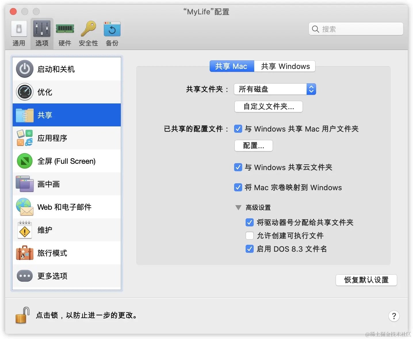 点击配置按钮,建议去掉Mac用户文件夹到Windows的系统的映射,尤其是桌面,如果你的Mac系统桌面本身就很凌乱,你又勾选了桌面文件夹的映射,那么当你开启虚拟机时:恭喜你,你又得到了一个凌乱的桌面!